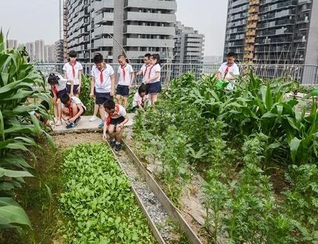小學的孩子們在校園房頂的菜園里照顧班級的自留地。該小學36個班每個班都在校園房頂有一塊“自留地”,按時來澆水、除草和收成。